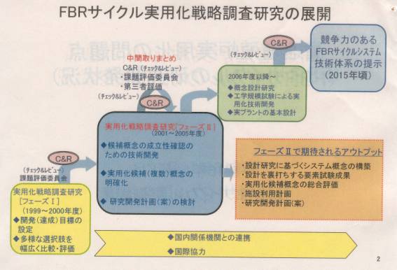 フェーズIでは炉型、燃料、再処理法を多岐に組み合わせて検討されたとのこと、そのようなことが可能なデータ、判断基準、根拠が存在するのか、そのための費用は?そして耐えられるのか?と懸念される。過去の蓄積も有ることであり、ナトリウム炉/UO2または金属燃料/湿式または乾式再処理ぐらいに絞って重点化すべきではないのか。フェーズII作業にフェーズIを引きずる必要があるのか、疑問に思う。また、実用化のステップの中で、初号機が必要になるのが何故2030年ごろになるのか、本戦略調査研究とGenIV(国際協力)との関係などを知りたい。
