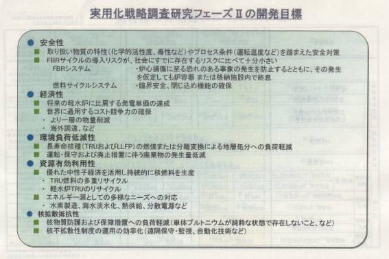 1999年7月に核燃料サイクル開発機構(以降JNCと略称)を中心にした「高速増殖炉サイクル実用化戦略調査研究」がスタートした。電力実証炉計画が見直され、時間的余裕ができたので2年間のフェーズI作業では多様な選択肢、すなわち炉型、燃料及び再処理法の種々な組み合わせを幅広く比較・評価する再検討を実施し、フェーズII(2001~2005年)では実用化候補概念の明確化、研究開発計画(案)の検討を行っておりこのほど中間取りまとめを行ったところである。2006年からは概念設計、工学規模試験による実用化技術開発、実プラントの基本設計を実施、2015年頃には競争力のあるFBRサイクルシステムの技術体系を提示するところまでもって行きたい。開発目標としては安全性(炉心損傷の防止と影響の緩和)、経済性(軽水炉との競合)、環境負荷低減(廃棄物量低減)、資源有効利用性(TRUサイクル)、核拡散抵抗性(単体Pu不存在など)を掲げている。