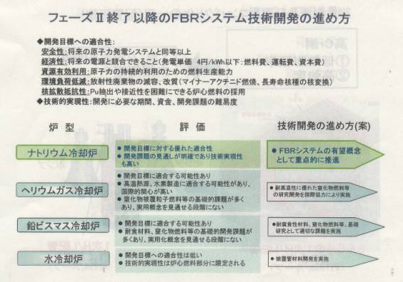 平成7年に「もんじゅ」が2次系ナトリウム漏洩を起こしてから、既に9年経つにも拘わらず、再開の見通しは全くはっきりしない状態であり、ナトリウム冷却型高速増殖炉の開発の状況についても、明確な表示が殆ど見受けられなかった。