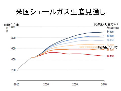 個々の生産井からの生産量は急速に減少するため、その減少を補い、さらに拡大していくために生産者は掘削活動を常に高めていく必要がある。したがって最も楽観的なケースでも、近年経験したような生産増を長期にわたって維持することを望むことはできない。したがって新政策シナリオ(資源量22兆立方米)でも2030年代初めごろ(ピーク生産量6,600億立方米)から生産量は下り始めると思われる。採掘地域が段々と質の悪い地層に向かわざるを得ないことがその理由である。少ない資源量の場合には、一番下のグラフ(14兆立方米)の曲線に見るように、2020年代初期にも減少が始まると予想される。